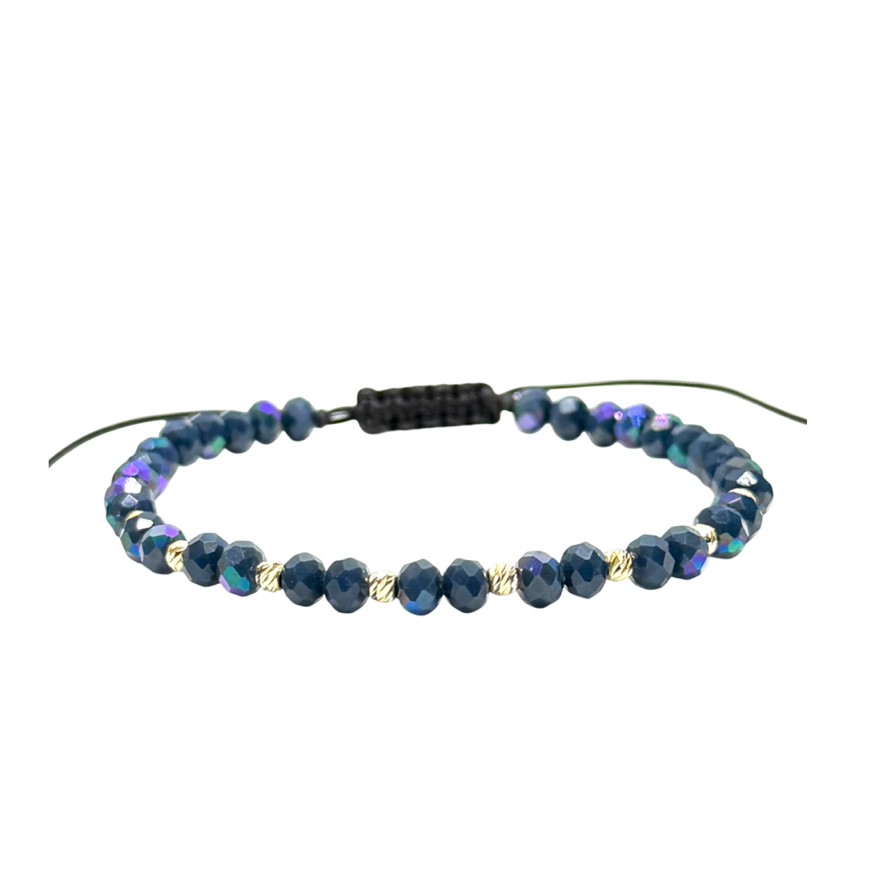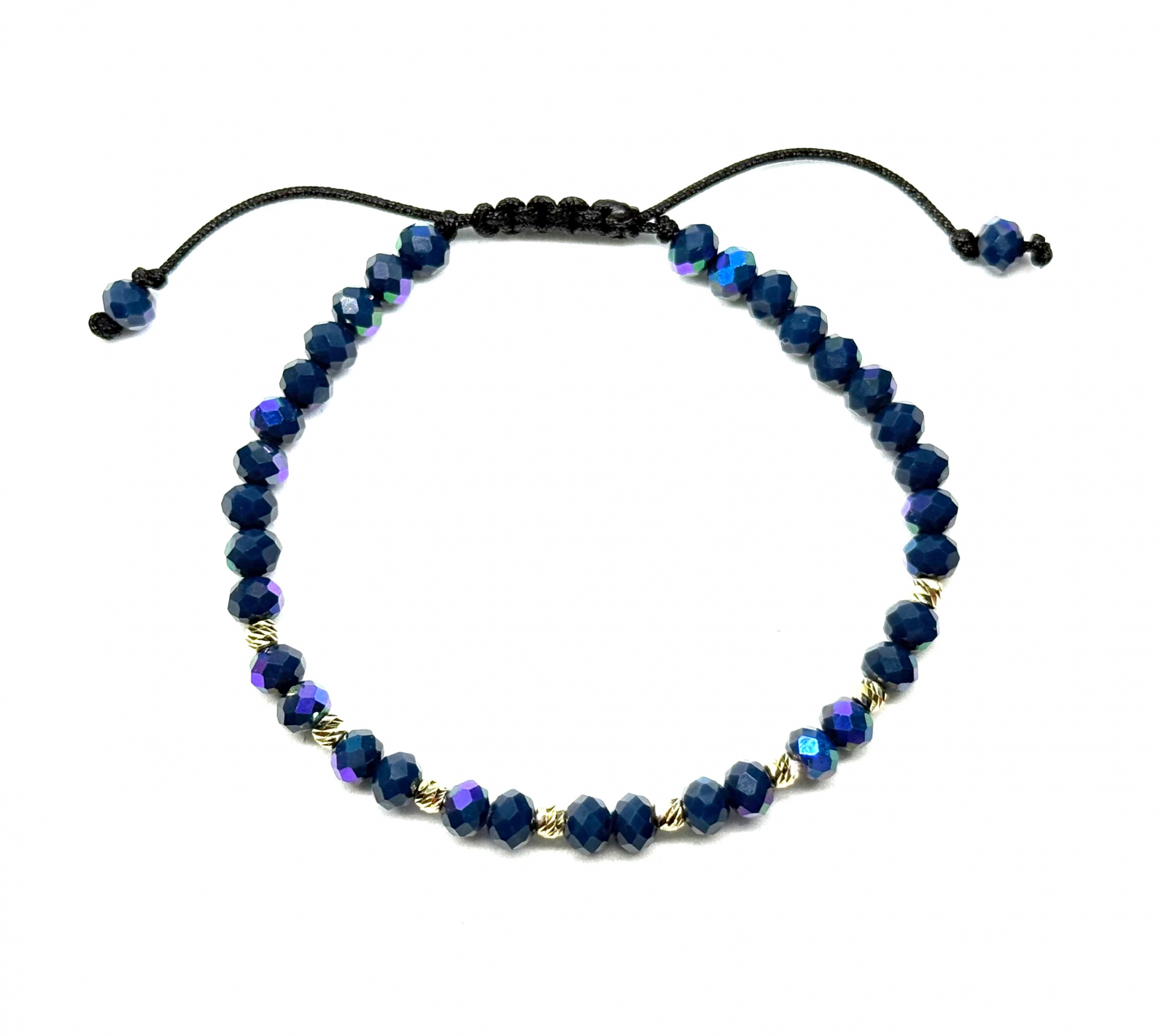 În procesul de creație manual am selecționat cu atenție pietrele semiprețioase din Cristal fațetat de culoare albastrǎ cunoscute pentru efectul de creștere a vitalității. Pe lângă aspectul subtil de mister și profunzime, Cristalul fațetat amplifică frumusețea și strălucirea sferelor din Aur de 14 Karate, oferind brățării o notă discretă de contrast. Ultima etapă a meșteșugului constă în așezarea elementelor pe un șnur de calitate premium, care aduce împreună pietrele prețioase și semiprețioase.